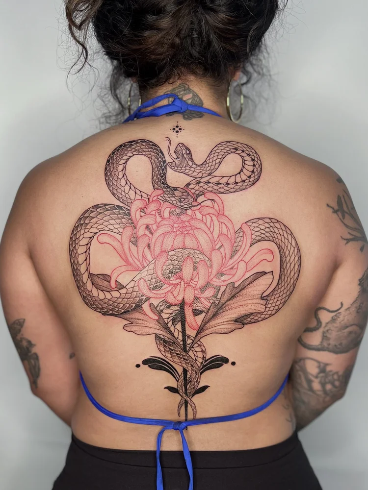 Olivia is a Las Vegas–raised tattoo artist working in the Downtown Las Vegas Arts District. She specializes in fully custom tattoos across illustrative, fine line, ornamental, and neo-Japanese styles—helping clients turn ideas into designs that feel personal, intentional, and built to hold up over time.